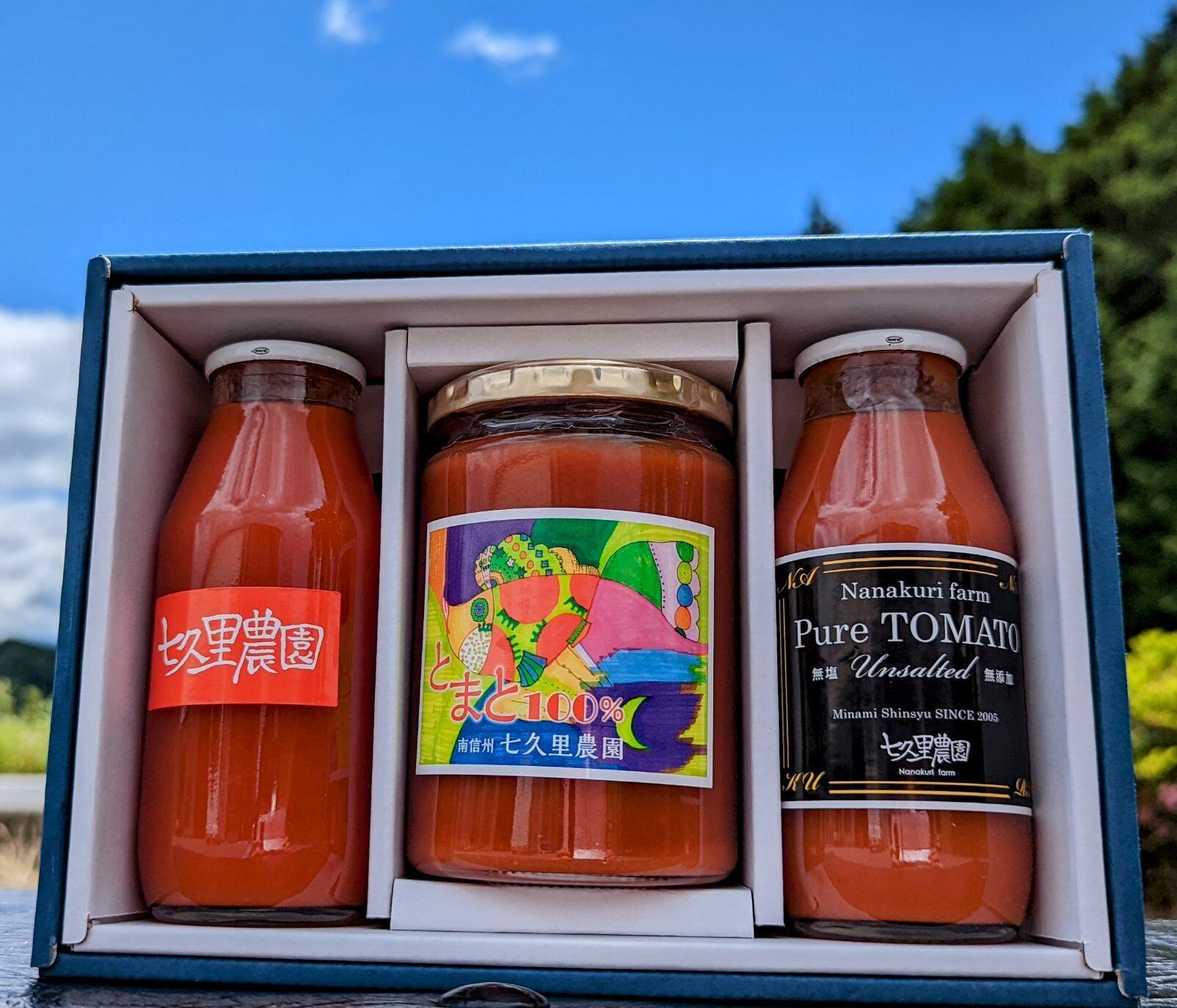 こだわり!七久里農園の生食用桃太郎トマトのみで作った、トマトジュース2種とトマトピューレの3点セットです。